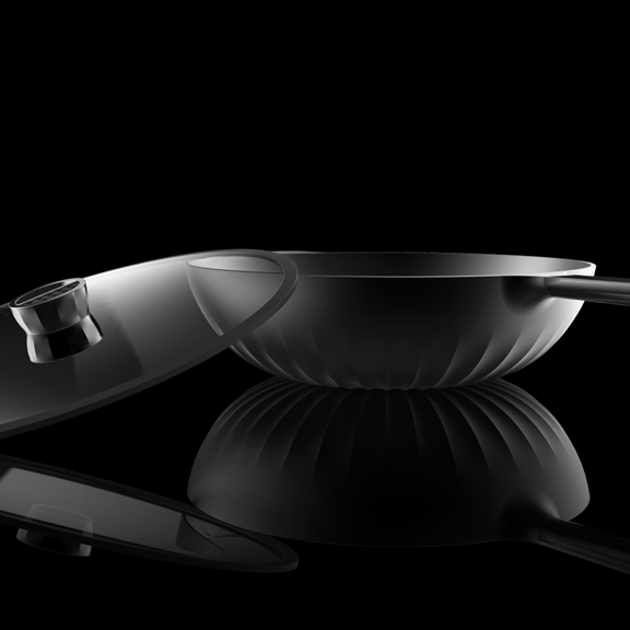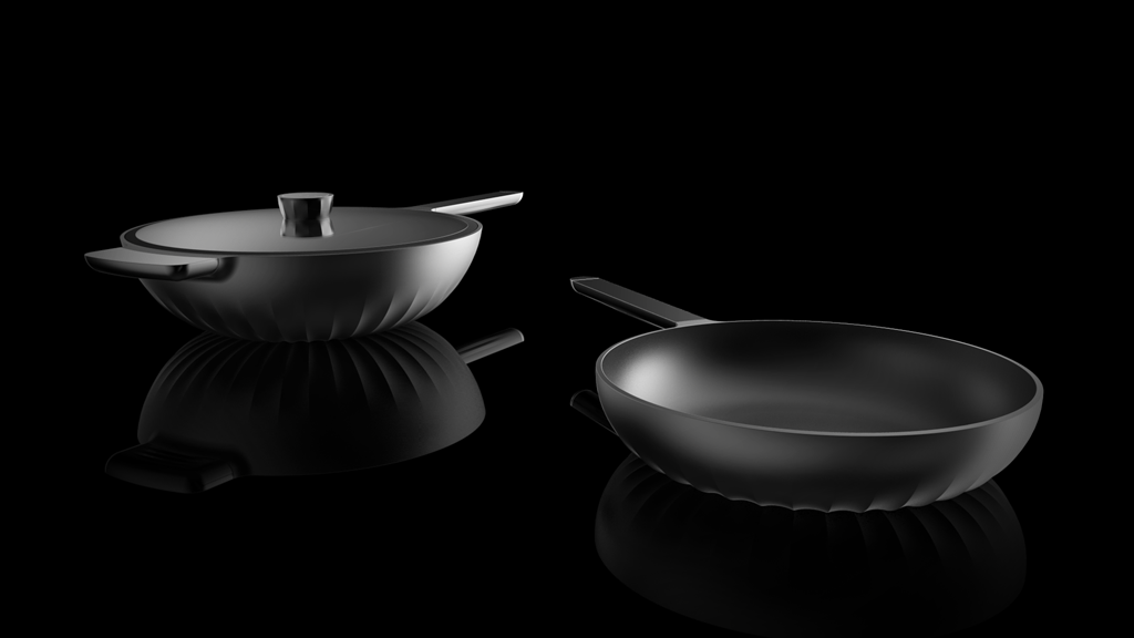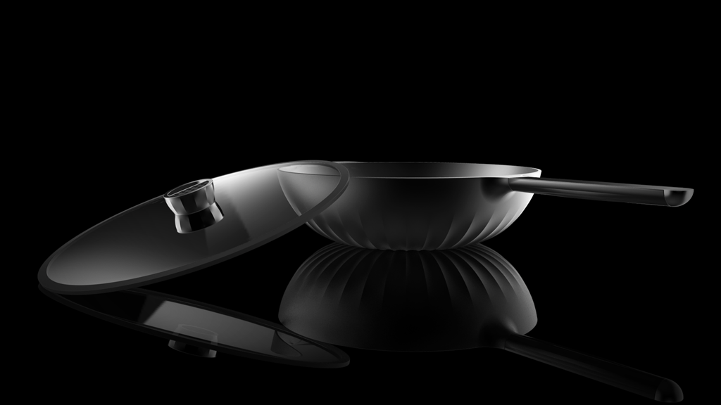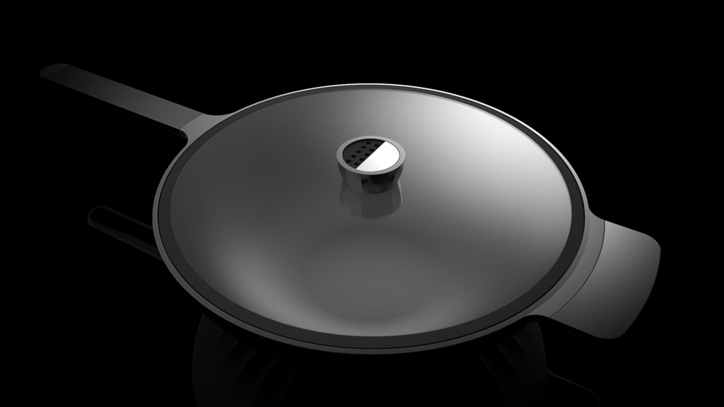 鍋具的設(shè)計是解決問題的一個關(guān)鍵點。受熱不均勻,熱效率低等都造成浪費資源和油煙重的問題。這套鍋具定位高端,本身材質(zhì)采用鋁合金,是具有高導(dǎo)熱系數(shù)的材料。鍋底的紋理在增加了鍋底與火焰的接觸面積的同時更是起到了平均分配熱量的作用提高了導(dǎo)熱效率也使得鍋底受熱更加均勻,有效的控制了油煙。鍋蓋把手上的孔洞有透氣的功能,且能夠根據(jù)不同的食材和烹飪的不同要求調(diào)整大小。凸顯雕塑感的紋理符合高端生活的氣質(zhì)。鍋底的紋理,把手的紋理,鍋蓋把手的紋理,雖然功能不一樣卻同樣在設(shè)計上具有一致性。處于家族感的考慮,煎鍋與炒鍋在局部都用了統(tǒng)一的形式語言。
