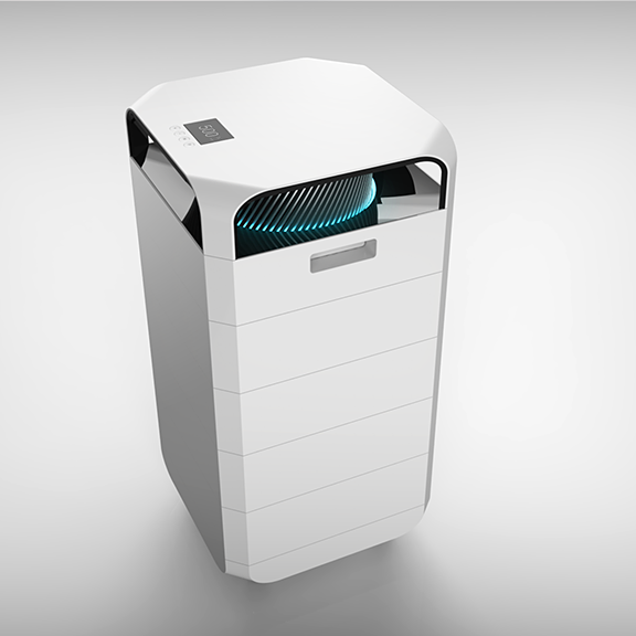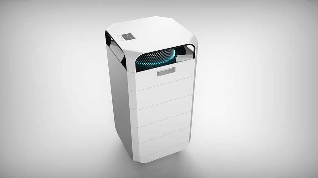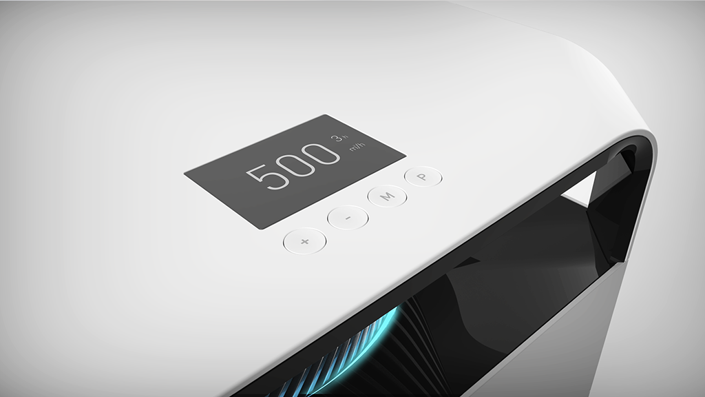 該產(chǎn)品底部進風,風機置頂,空氣流經(jīng)層層濾網(wǎng),由頂部的風機將潔凈的空氣向四個方向噴出,合理的結(jié)構(gòu)保證了盡可能大的濾網(wǎng)有效橫截面積,減少空氣流經(jīng)路徑的轉(zhuǎn)向?qū)艋芰淼挠绊憽A硗饪諝鈨艋魈峁┝怂膶游恢冒惭b濾網(wǎng),可靈活自定義,根據(jù)自身需求靈活選擇濾網(wǎng)組合。同時還創(chuàng)新性地提供了多款專效濾網(wǎng),針對甲醛、細菌、煙味等,專注于解決不同使用環(huán)境中用戶的痛點,滿足每一個用戶對潔凈空氣的需求。設(shè)計概念重點表現(xiàn)未來感及科技感,電機防護罩周圍的隱藏式燈帶可直觀的反映出室內(nèi)的空氣質(zhì)量情況,是整個設(shè)計的點睛之筆。設(shè)計語言在保持硬朗高效率寓意的前提下也進行了去邊角處理,增加產(chǎn)品的友好性。色彩材質(zhì)方面以代表潔凈的白色為主色調(diào),電機罩部分以銀色寓意功能強大,中間以黑色進行過度和增加對比。體現(xiàn)出外表極致簡潔,功能極其強大的核心理念。